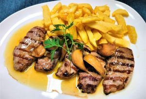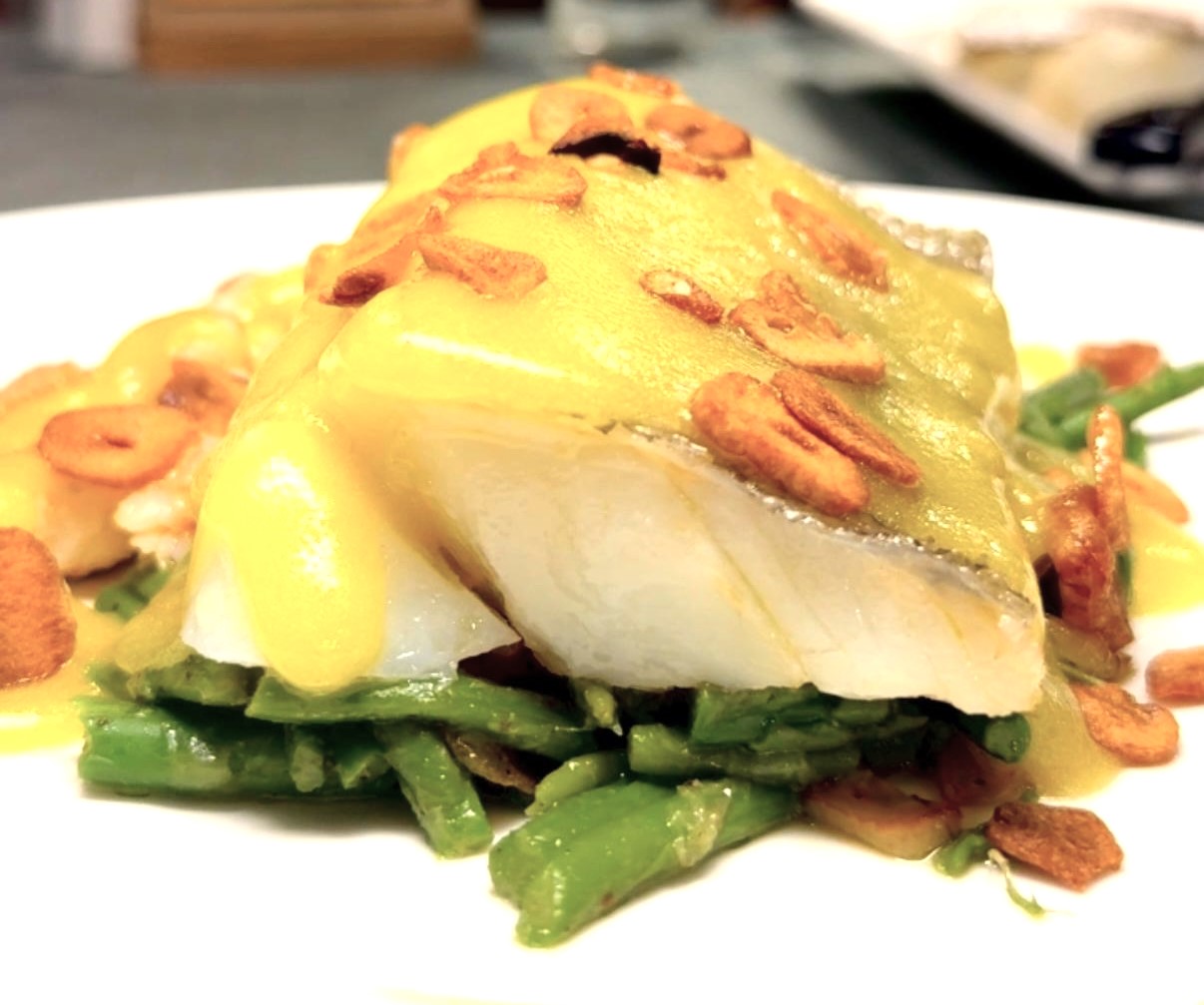 - Lomo de Bacalao al Pil Pil con Langostinos y Espárragos Trigueros