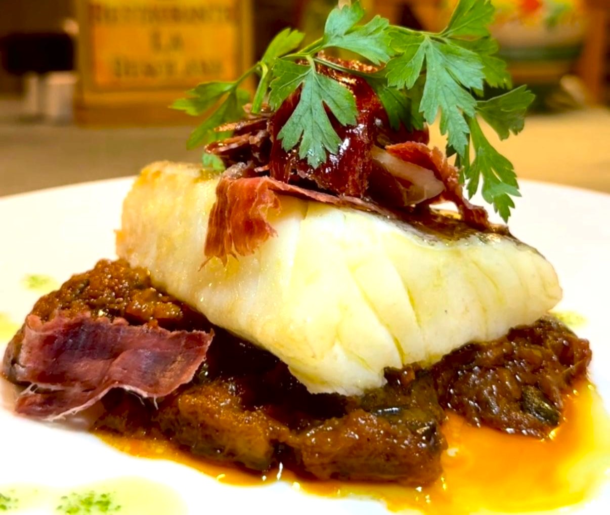 - Lomo de bacalao sobre pisto de verduras y jamón
